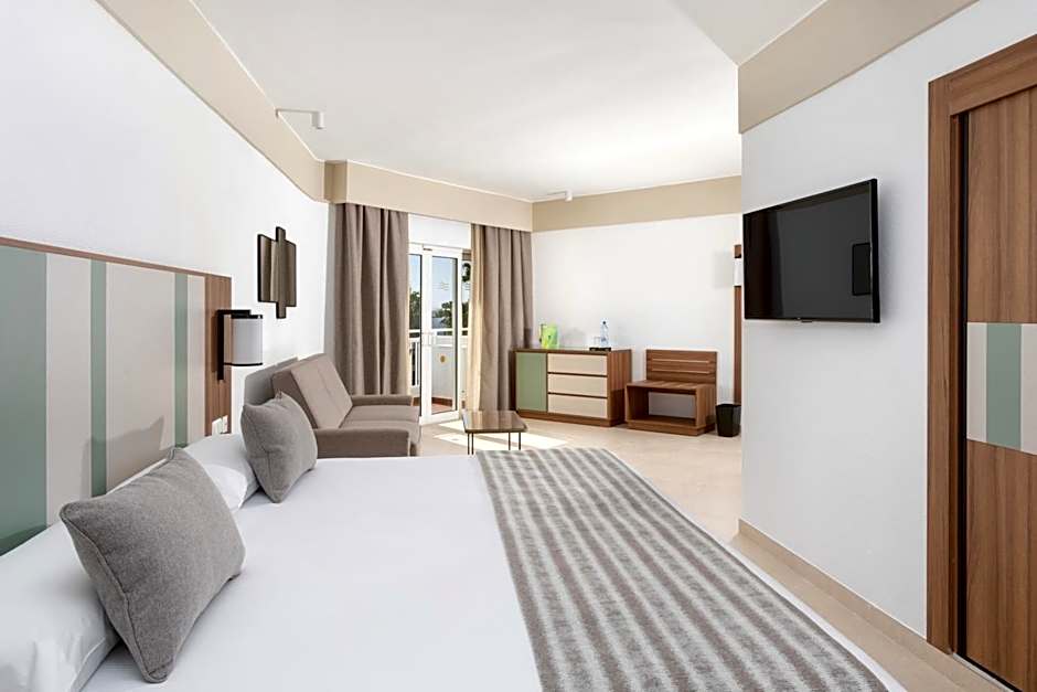 Suite with sea view is 398 square feet and includes either a king-size bed 150-183 width or 2 single beds 80-130 width plus a sofa bed plus satellite tv .